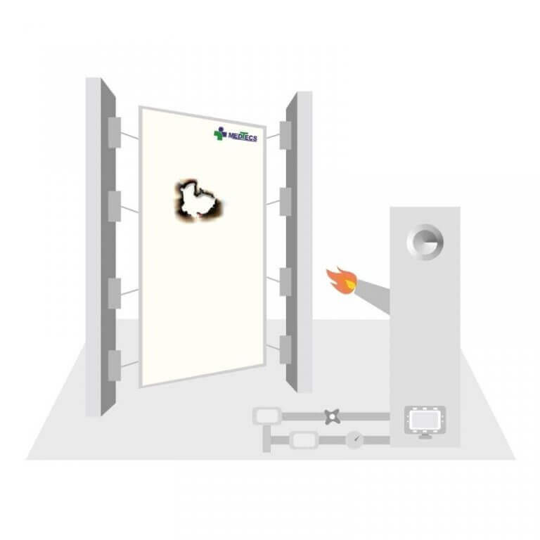 11612B (ISO 9151) – Heat Transmission TestConvective heat: determination of the heat transmission when exposed to flames. The sample is held above the flame and the rise in temperature on the top side of the sample is measured with a calorimeter. Subsequently, the length of time the sample can remain exposed before its temperature rises by 24 °C is determined.